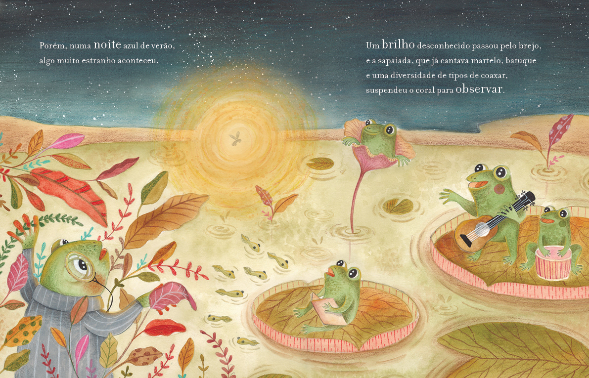"O protagonista desta história vive desconfortável na própria pele. Meio acuado, ele parece abrigar dentro de si um medo que chega a imobilizá-lo. Até que um dia tudo isso muda. A obra constrói de maneira poética a trajetória de um sapo que se reinventa e descobre a alegria de ser ele mesmo, aceitando sua própria natureza e tornando-se cada vez mais interessado em experimentar suas potencialidades."